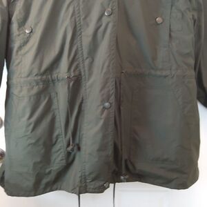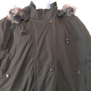 Woman Within (size 3X 30/32) dark olive green snap and zip front anorak jacket with removable quilted lining and removable fur-lined hood, 4 front pockets, snapped down back flap, and elastic adjustable sleeve cuffs. NWOT (never worn)