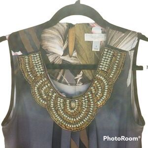 Green and copper beads woven around front neckline. Beading is in perfect condition.