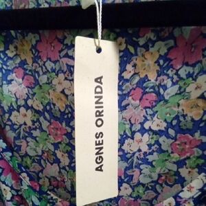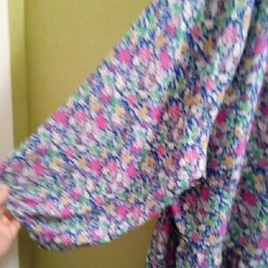 This blouse features a charming floral design in pink and purple, highlighted by its relaxed fit and flutter sleeves. The tunic style offers a comfortable yet stylish look, perfect for everyday wear or special occasions. preowned and laundered