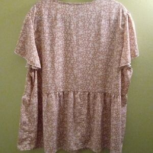 This pink blouse from SHEIN showcases a relaxed fit with a stylish tie front and ruffled accents. The short sleeves and lightweight fabric offer a breezy, feminine touch, perfect for casual outings. Its flowing silhouette adds a touch of elegance to any ensemble. preowned and laundered