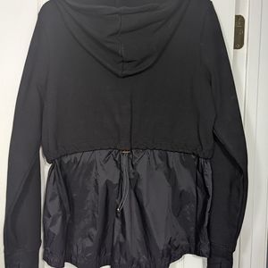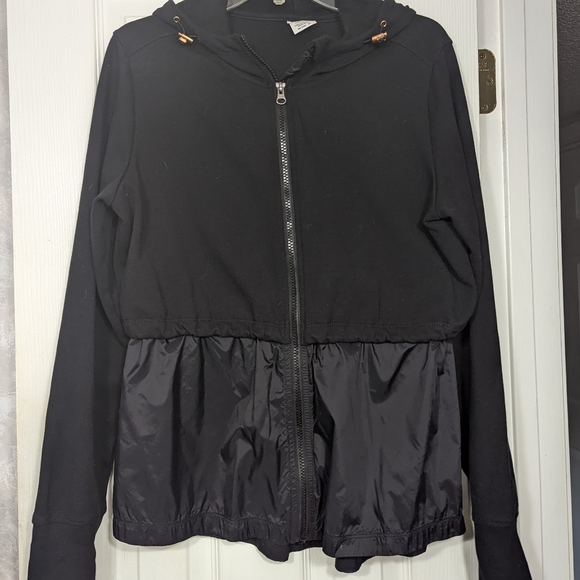 This black jacket is half sweatshirt material and the bottom half is rain coat material. Nice on a cool day over a tank top and gym leggings.