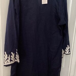 An attractive tunic for beach or with leggings. Size 1 X (14-16) White coral applique on front and sleeves. Slits on side.