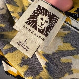 Woman’s Anne Klein wrap blouse size Large, in good used condition. Black, white and yellow in color. Has a houndstooth pattern. Long sleeves. Cinch stretchy waist. Material is 95% polyester and 5% Elastane. Length is about 26 inches and armpit to armpit is about 21 1/2 inches.