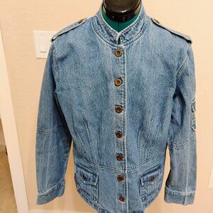 The Bay Studio Khakis Blue Jean Jacket is a stylish piece featuring a mid-blue denim fabric. It's designed with a semi-fitted cut, making it versatile for layering over various outfits.