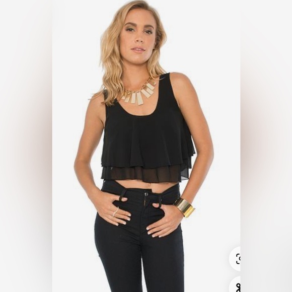 Black flowy ruffle chiffon layered cropped top. 2 layers of flowy fabric. Loose fit Size M. Bottom has 2 flowy layers. Cute with high waist jeans or skirt.