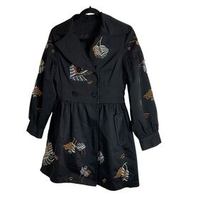 Features a double-breasted design and long sleeves flared lower section, reminiscent of a peplum or A-line silhouette.