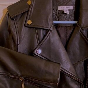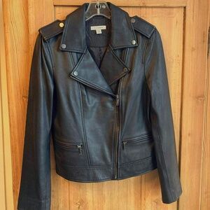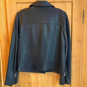 Woman’s BLACK Genuine Leather Motorcycle/Rider Jacket, Size Medium (8-10) - NWOT. SUPER SOFT genuine leather, snaps & zippers in all the right places. A really flattering cut - not too boxy. Classic Rider-Style jacket. Pure Navy brand -- purchased from Saks - The photos didn't capture it, but this is a true black butter-soft leather. Measurements pit to pit 19”, shoulder 16”, sleeve 23”, length (top of collar to bottom of jacket) 24.5” THIS JACKET IS A STEAL! From a smoke-free home. NWOT