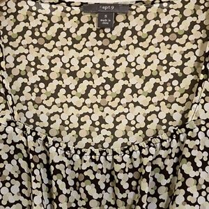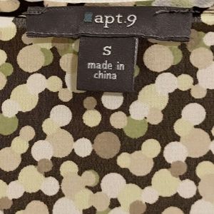 This blouse has a comfortable fit with cap sleeves, soft molded cups with shirring, sweetheart neckline with shirring and a silk brown ribbon for tie back of garment. Blouse has shades of brown, cream and green with a silk brown ribbon.