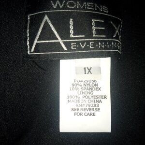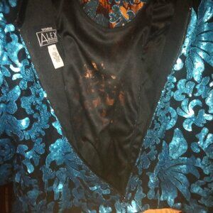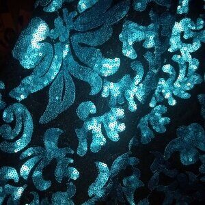 New w/o tags. Gorgeous blue/black/mesh/sequins. Zipper closure in back. Pleated, lined. Long, mesh sleeves, vibrant blue flower design