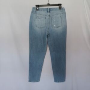 These are a pair of size 4 blue jeans with tags on. They are mid rise blue jeans.