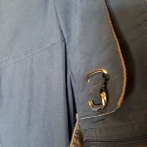 Nice mid weight to this cool weather jacket. Izzi Grey Blue with dual pockets and string to adjust bottom hem. Zipper closure with covering placket that snaps closed. Collar can be worn down/open or stand up when zipped all the way up and also has adjustable tie closure. Sleeves also have snap straps that can be adjusted. Contrasting beige lining. This is 85%Polyester and 15%Nylon with a sueded feel. Machine wash cold. No flaws/issues. Smoke free, pet free, fragrance free home.