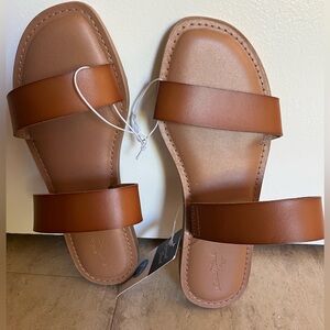 New with tags Stylish 2 band brown leather slide sandal. Perfect for casual wear. Tag says the color is cognac size 7 1/2 wide universal threads brand with cushioned insole foot bed. There is elastic on the strap closest to your ankle on one side.