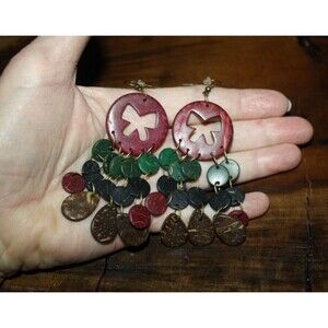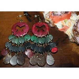 Women's colorful dangle earrings. Fishhook backs. Colors: Maroon, green, black, brown, pink. Round with bow cutout. Round & oval shapes. New with tags.
