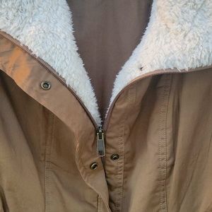Women's Columbia lightweight, dark tan jacket with soft cream colored lining around the neck. Zipper and snap closures with pockets. Size large. Great condition!