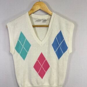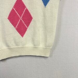 Features - Cream with pink, green, blue diamond pattern, pullover vest, v neck