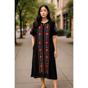 Woman’s Embroidered Kaftan Dress Black ONE SZ 100% Cotton Lightweight Boho Mumu