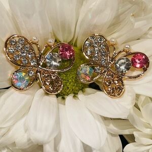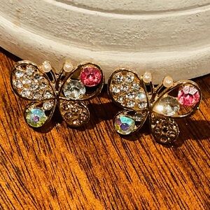 Check out these Elegant Gold Tone Rhinestone & Faux Pearl Butterly Design Earrings .
