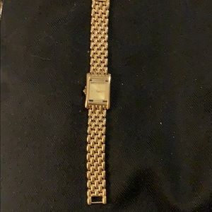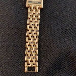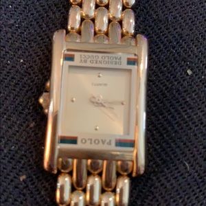 This is a woman’s Gucci watch designed by Paolo Gucci. The watch is a Chan like design band. The photos show the face, back and Gucci stamp! The watch is gold over stainless steel. The watch will need a new battery!