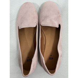 This is a pair of women's H&M slip-on flat ballet shoes in a pale soft pink color. These shoes have a round toe shape and are designed for easy slip-on closure. Made with fabric (faux suede) material, they are comfortable and stylish for everyday wear. With a US shoe size of 7.5/8 and Eu 38 these shoes are a fashionable and practical choice for any woman's wardrobe.