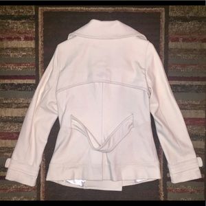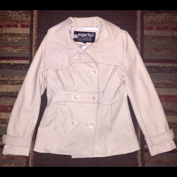 Woman’s Jacket beautiful cream color. Made by Sugarfly. Belted. Size Medium. 50% Wool and syn. Two pockets.