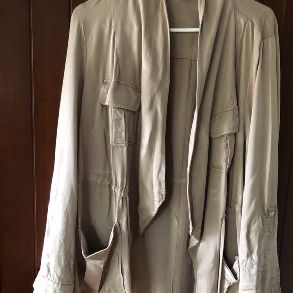 Woman’s light weight tan jacket. Tie waist. Suitable for a cool day. Size 2 (plus size)