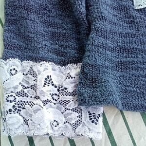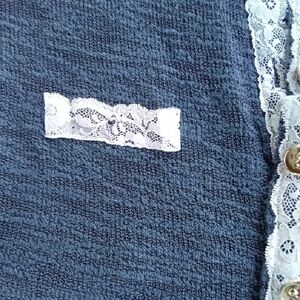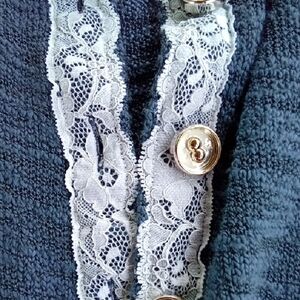 Elegant blue cardigan with delicate lace trim. Perfect for adding a touch of sophistication to any outfit. preowned and laundered