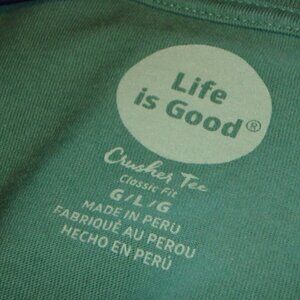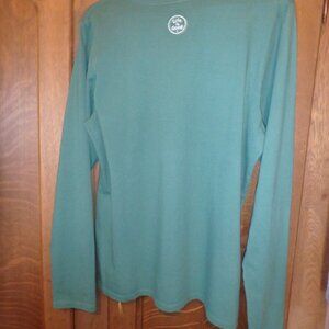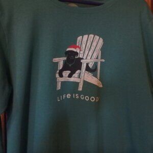 Womans Size Large, Life is Good - Black Lab with santa, Long Sleeved Tee. Green. Measuresments: 21" across chest, 18" Length from under armpit to bottom. In like new gently worn condition.