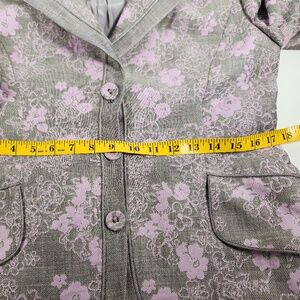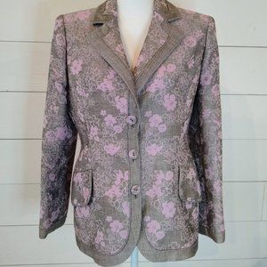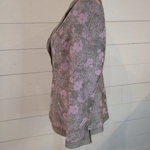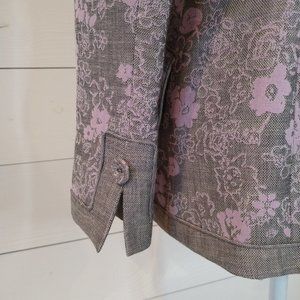 Woman's Lourdes Chaves blazer. In a lavender purple and gray floral print. 100% pure wool. Three-button closer, two front pockets, cute sleeve hem details, fully lined, nice tailored fit. Woman's size 8. Made in USA