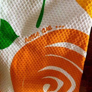Gorgeous Vintage Dress! Orange, Yellow, Green, & White bright 70's Psychedelic dress in textured cotton fabric that has rose prints that says "Roses are..." Buttons at the waist. Fabric covered buttons. This dress is in immaculate condition and appears to have been hardly or maybe never worn for it's age.