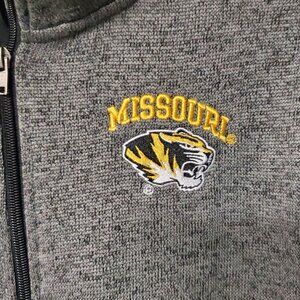 The product is a women's Missouri Tigers zippered gray jacket with a high neck, officially licensed by Knights Apparel. It is designed in size 2XL, perfect for football fans who support the Missouri Tigers. This jacket is ideal for the regular season, with a capacity of 20 oz, and is a stylish and comfortable way for women to show their team spirit while staying warm during outdoor activities. Measurements are 30" Sleeve, 26" Length, and 46" Chest. Excellent condition. Smoke free home.