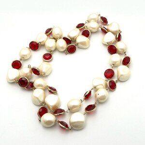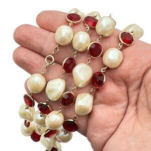 Womans Necklace Red Crystal Faux Pearl 34 Inch Gold Tone Statment Vintage
