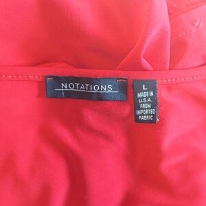 Soft, stretchy matte jersey material, bright red, quarter sleeve, scoop neck with strips of sheer fabric accents down the front.
