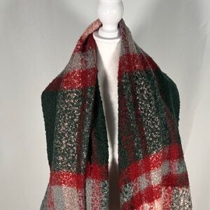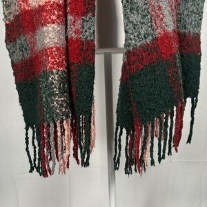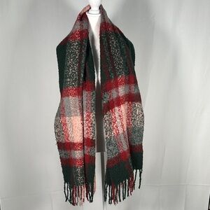 Cozy plaid scarf with fringe. Features red and green colors. 100%Viscose