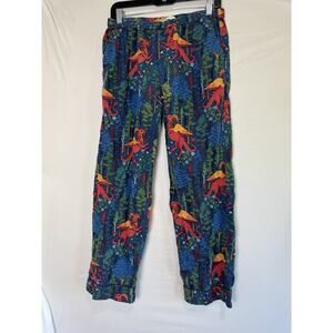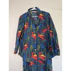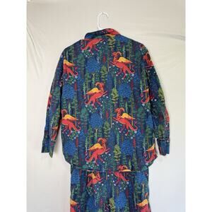 The product is a woman's organic cotton pajama set featuring a dragon print in size small. It is made by the brand Print Fresh and is made of 100% organic cotton, providing a comfortable and sustainable option for sleepwear. The multicolor design adds a playful touch to the set, making it a unique and stylish choice for women looking for cozy yet chic sleepwear options.