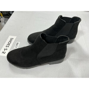 These Women's Pull-On Booties are a stylish and comfortable choice for any wardrobe. Featuring a round toe shape and a flat heel, they are perfect for everyday wear. The elastic ankle, pull on closure, and faux suede upper material provide a secure fit while the black color adds versatility to any outfit. With a US size of 9.5/10 and EU size of 40, these booties are designed for the modern woman. Whether dressing up or down, these booties are a must-have for any fashion-forward woman.