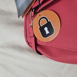Stylish pink handbag featuring a gold heart lock. Perfect for any occasion.