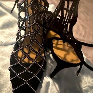 New never worn. Very pretty closed toed heels with a tie back. Lots of shimmer with the rhinestones