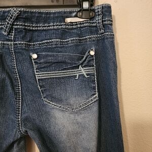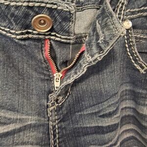 Used: Women's ripped jeans are bootcut fit, button and zipper in front, pockets in front and back, has belt loops stones on corner of pockets for that classy look.. These Women's jeans are used great condition ๐ ๐ size 12. Have any questions feel free to ask ๐