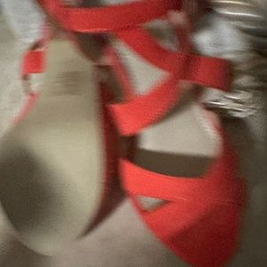 Beautiful Coral colored straps sandal with crystal embellishment on platform and heel.