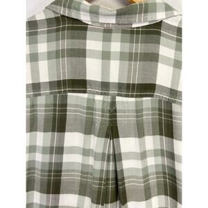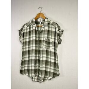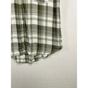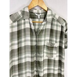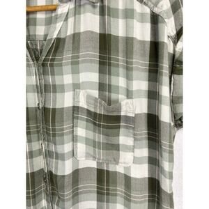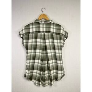 Woman's Short Sleeve Green White Plaid Button Down Top - Size Medium