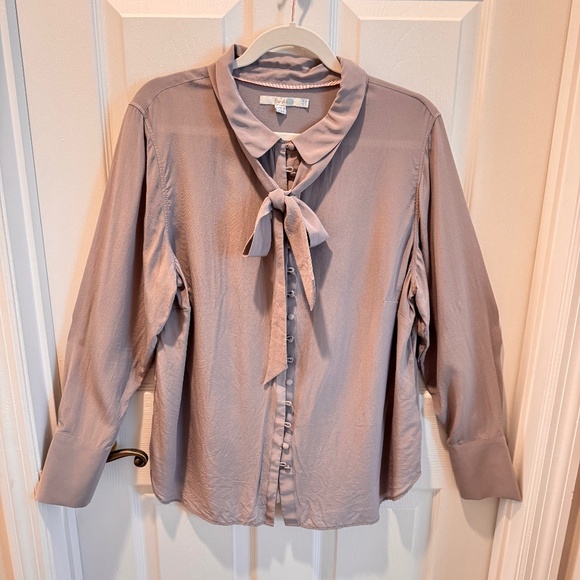 Boden brand, woman's silk button up blouse with ribbon scarf. Eyelet button up. Button cuffs. 100% silk. Size 16. Measures 28 1/2" length, 22" underarm to underarm. Condition is good. Very feminine. Lightweight and airy.