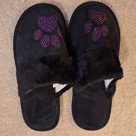 Black step-in slippers with cute paw design in purple. Easy to slip into when you just need a little something on your feet. Marked as size 9, but fit is closer to a size 8. Very lightly worn, excellent condition. Non smoking, dog friendly household.