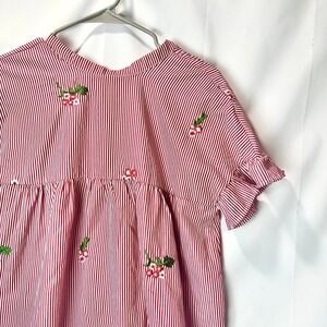 Capture the essence of whimsical charm with this delightful dress. A playful dance of red and white stripes sets the stage for embroidered floral accents, adding a touch of nature-inspired elegance. The dress features a comfortable, relaxed fit, perfect for all-day wear, while the ruffle sleeves introduce a flirty, feminine detail. Imagine twirling through a sun-drenched garden party or enjoying a festive holiday gathering in this eye-catching piece. This dress is ideal for a casual brunch with friends or a relaxed family celebration.