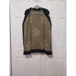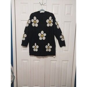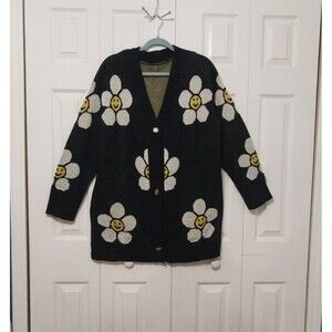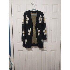 Womans Sunflower Smiley Face Cardigan Sweater Button Down Black Acrylic Light XL