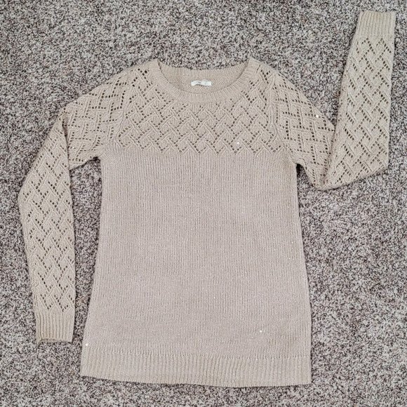 Woman's Size Small, Beige, Pullover, Polyester, Acrylic,& Metallic, Long Open Weave Sleeve Sweater by MAUNCES