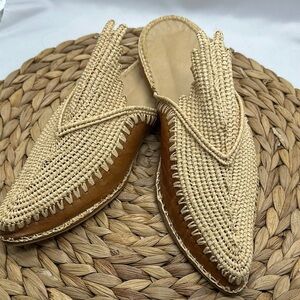 Woman’s Tan Leather and Cream Woven Raffia Slippers Very Unique