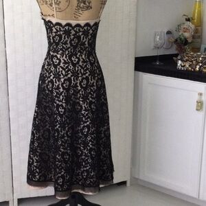 Woman’s Tessuto Party Cocktail Dress size 6 color black & a light peach. It has Spaghetti Straps block lace lined and has a side zipper