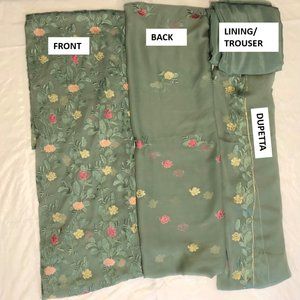Chiffon with rasham embroidery. Flower outline done in tilla. One sleeve will come out of the front of kameez and the second sleeve will come out of the back of the kameez. 4 pieces suit.