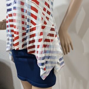 Woman's Vibrant Red White Blue Striped Top Size M Studded Design Hi-Lo Hem Chic