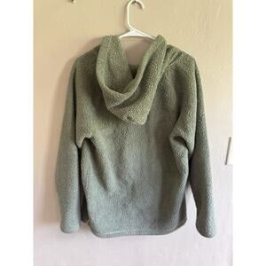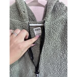 The product is a women's Victoria's Secret Pink sherpa quarter zip hoodie in green, size small. This pullover hoodie features a zip closure and is part of the Victoria's Secret PINK product line, making it ideal for activewear occasions. The soft sherpa material provides warmth and comfort, making it a cozy and stylish addition to any wardrobe.